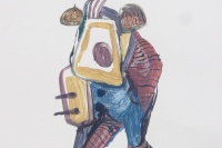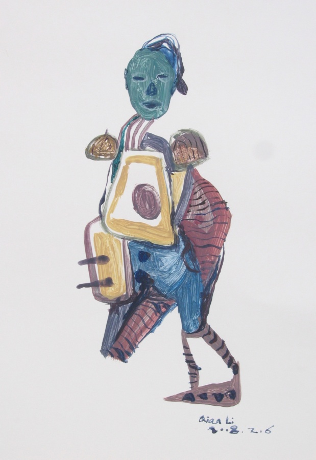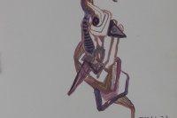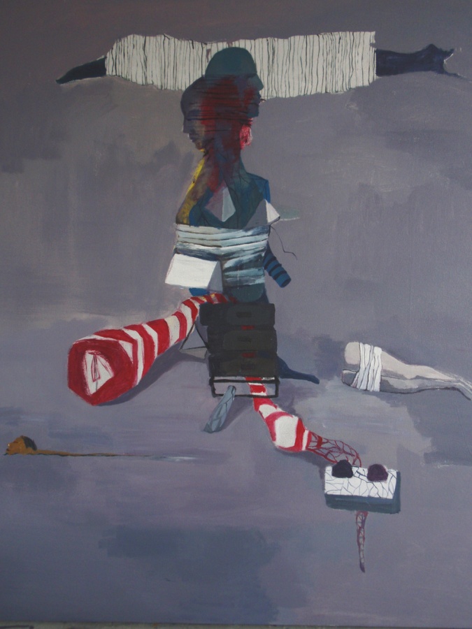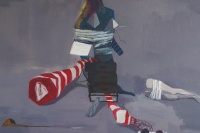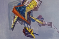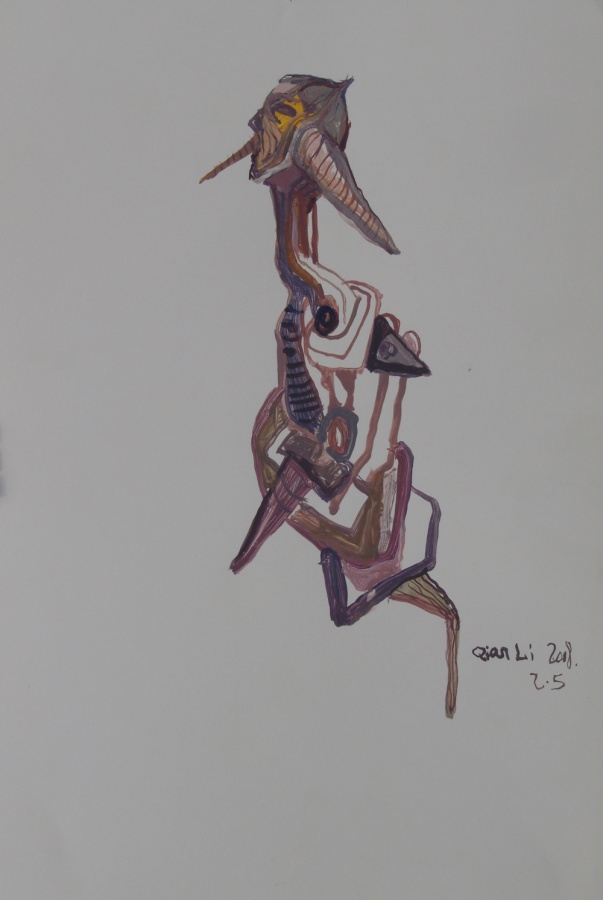 作品中身体被拆散,形体被篡改,身体各个部分成为一个个建构作品的“元素”,身体部件与几何化的形体相互编篡,把作品具象的情景导入抽象的领域,这些碎片化的组合构成了主体的状态,作品不仅仅是潜意识主导的臆想更是对物象主动的编篡和臆造。作品带有很强的叙述性,它不是现实中的叙述,而是指它的“元素”之间是有一种叙述关系,脱离主体被分离的部件也成为被辨认的携带主体信息的符号部分。作品中大脑与身体呈现一种平行状态,性不再是肉体的外在献媚而成为同大脑主动性同质的可被思考与游戏的客观符号。那些混淆性别带有攻击性的身体变异无非是大脑发起的攻击信号,双面混淆性别的变异的人无非是心理的一次变异手术,像是在制造它者与己对话和抗衡,暗示着一种心理场域的辩驳。