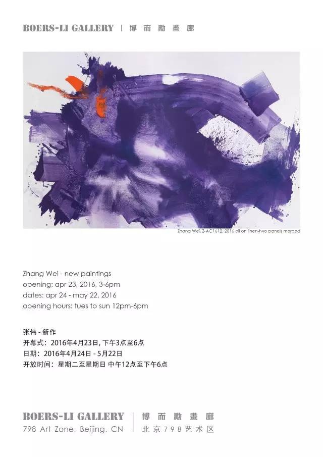 即将登陆博而励画廊的新作,标志着张伟更深层次的实践与创新。在美国生活近20年的丰富的跨文化体验(2005年他回到北京定居),弥合了张伟对西方抽象艺术大师们的理解和对自己文化传统的崇敬,借鉴了齐白石和徐渭等传统画家的手法,通过需要体力的自由挥洒的笔触与他的个人体验一同融合在了画布上。从他的新作可以看出,他运用鲜亮的色彩和手中画笔的随意移动,一切渗透到画布上,又在画布上的流白,见证了西方的现代主义与中国的水墨画的完美结合。对张伟来说,画布被想象为一个三维空间,他并不担心采用其他现成材料或画布以外的媒介来突破油画颜料和画笔。在这种意义上讲,绘画的行动才是张伟借以获得精神自由的媒介。