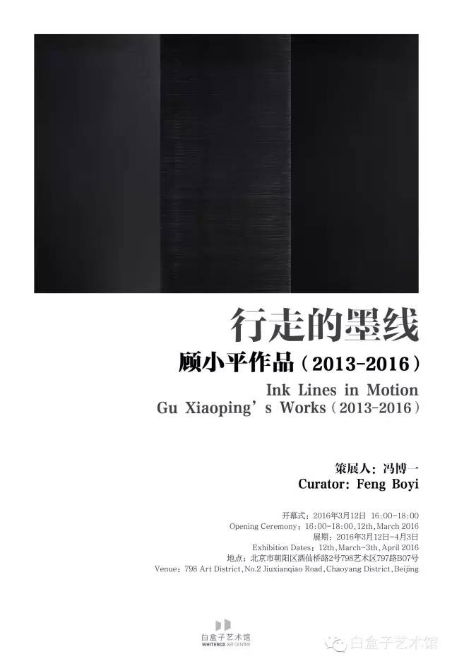 由白盒子艺术馆主办,冯博一策划的“行走的墨线——顾小平作品(2013-2016)”展览,将于2016年3月12日-4月3日在北京798艺术区白盒子艺术馆举行。