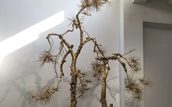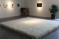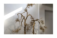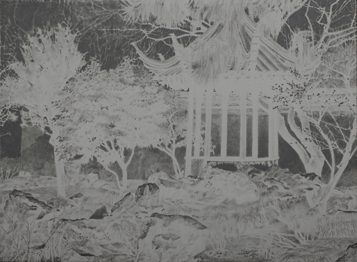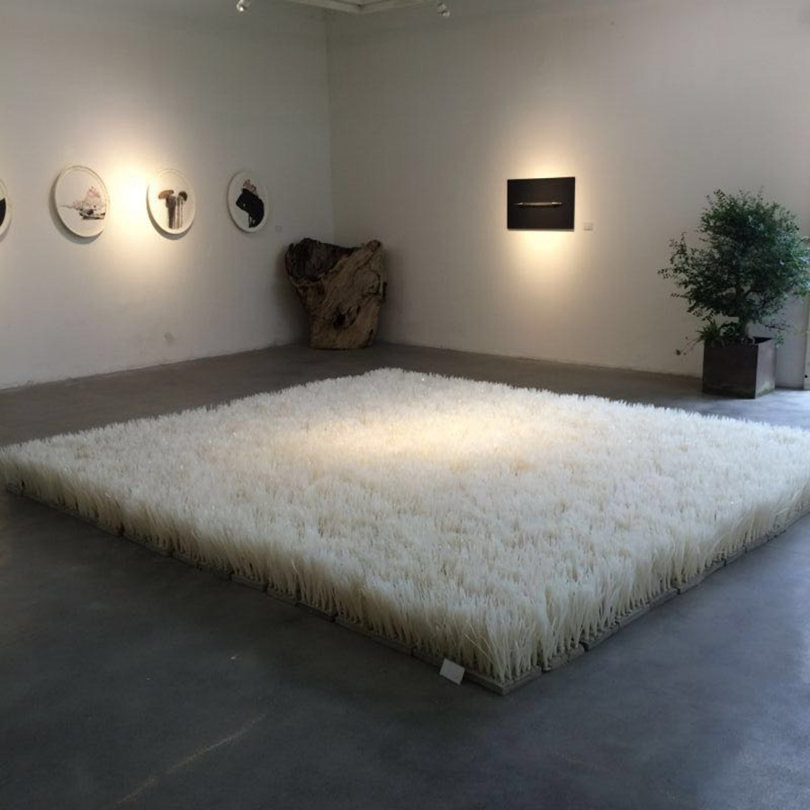 整个《假园》展览,从我的策划理念到艺术家的创作,使用了“假借”的艺术方式。中国园林以家族姓氏题名者很多,《假园》,假借“贾园”之声,听上去几乎是一个私家园林,其实是一场当代艺术的展场和游戏场,在整体观念的表达统领下,每个艺术的作品又是独立的、个人化的。你可以看到──灰尘打磨成镜面的“影壁(张震宇)”,原样翻制的不锈钢太湖石(展望),建筑扎带栽种在水泥上的“草地(余加)”,手机软件走出来的北海湖水(杨千),铅皮金条塑造的“山(张伟)”,被现代概念的“方直”切割打磨的、失去传统审美瘦漏透的太湖石(王长明),原样翻制的铜质金色的松树、椅子、太湖石组合的“文人画”场景(史金淞),纺织材料手工缝制的花圃(杨帆),木板绘制和铜树组成的“欲望花园(陈春木)”,不锈钢、玻璃钢等废弃材料长在一起“盆景(杨光)”, 金属丝编制的昆虫和花朵(苏亚碧),各种非传统绘画方式绘制的“透窗(谢帆)”、花窗(廖建华)、圆窗(何成瑶),透视解剖园林的丝面绘画(洪磊),金属丝原样编织翻制镂空的门扇、条屏、古琴(师进滇),非写实意义的绘画屏风(靳卫红),铅笔完全涂盖的官帽椅、几、梅兰竹菊条幅,和电脑键盘“键”像素化马赛克拼贴的《千里江山图》(孟柏申),意象多彩的陶瓷花园(沈岳)。另有两个“无形”作品,一个是“嗅觉体验”,采集展览当地、当时原料制作的香(欧阳文东),一个是“听觉体验”,以现代观念改造的中国传统乐器和中国音乐的自创曲目(李博),还有一个“视觉体验”,现代“假性生活”的录像作品。