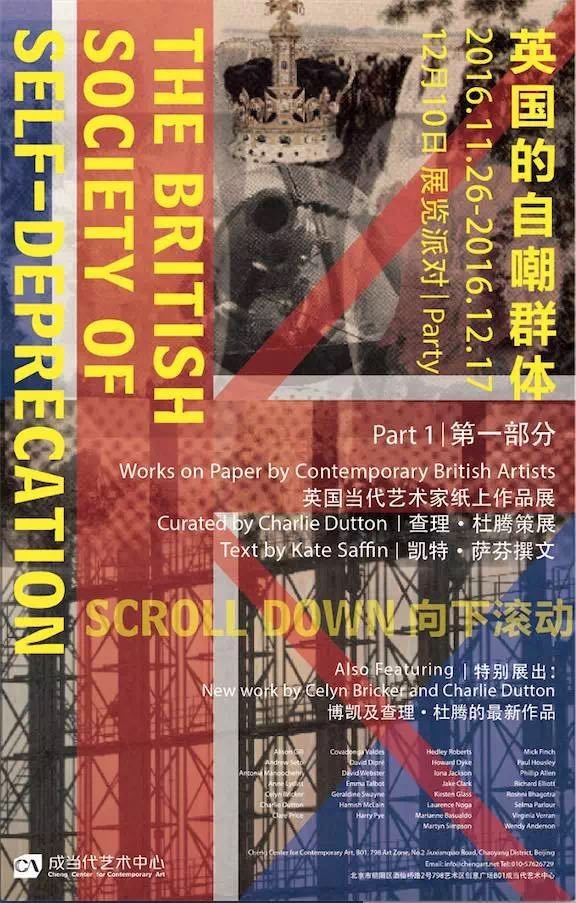 “向下滚动”是一个独立的宏伟项目,也将在“英国的自嘲群体”展览中呈现。一大幅画纸将在展厅中层叠悬挂,像古老的挂毯或是地震仪一样翻滚而下。两个星期的时间里博凯和查理·杜腾将现场作画,每天以修士般的忠诚投入其中,创作一件全新的艺术作品。史诗性的画作将展出并依据观众的要求切割进而零散出售。自由市场经济学将决定整体如何被雕刻,被打破。它将被有依据的衡量和定价。没有什么是神圣的,而任何东西都可以被切除。
