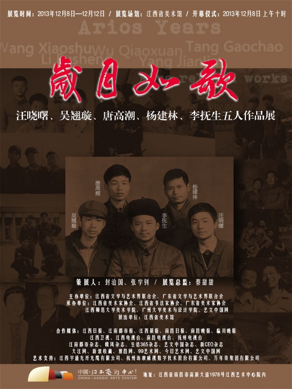 汪晓曙、吴翘璇、唐高潮、杨建林、李抚生五人,他们在“文革”中共同度过了少年的求学生涯,共同的爱好让他们走到了一起,尽管在日后,不尽相同的成长经历让他们的人生轨迹发生了变化,但无论是作为专业画家的汪晓曙、吴翘璇、杨建林,还是走向仕途的唐高潮,以及曾经下海经商的李抚生,把他们四十年始终联系在一起的纽带,无疑是友谊与艺术的红丝线。四十年弹指一挥间,昔日的翩翩少年已早生华发,在历经无数次的人生抉择和摸爬滚打后,少年的艺术之梦却依然坚定。岁月如歌,如今,当初“只争朝夕”的少年们再度以青春的梦想和憧憬,热情地为我们奉献出一场艺术人生的视觉对话,这是一种怎样的感动和执着。