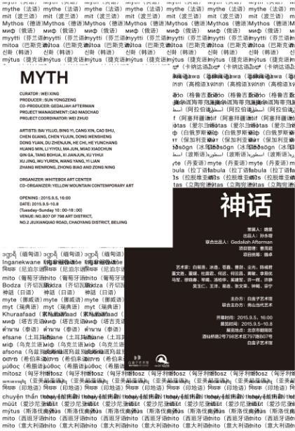 2015年9月5日,由策展人魏星策划的群展《神话》将在白盒子艺术馆开幕,本次展览将呈现26位当代艺术家的30余件作品。作品囊括影像、摄影、装置、雕塑、绘画等众多艺术表现形式,试图在暗黑的空间中通过不同艺术形式之间的呼应,再现原始神话的空灵与神秘之境,以此展开对当代艺术神话现象的探讨与反思。